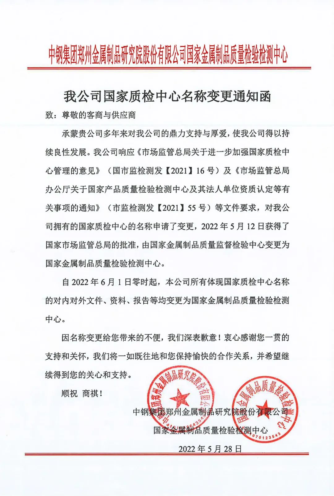 承蒙貴公司多年來對我公司的鼎力支持與厚愛,使我公司得以持續良性發展。我公司響應《市場監管總局關于進一步加強國家質檢中心管理的意見》(國市監檢測發【2021】16號)及《市場監管總局辦公廳關于國家產品質量檢驗檢測中心及其法人單位資質認定等有關事項的通知》(市監檢測發【2021】55號)等文件要求,對我公司擁有的國家質檢中心的名稱申請了變更,2022年5月12日獲得了國家市場監管總局的批準,由國家金屬制品質量監督檢驗中心變更為國家金屬制品質量檢驗檢測中心。...