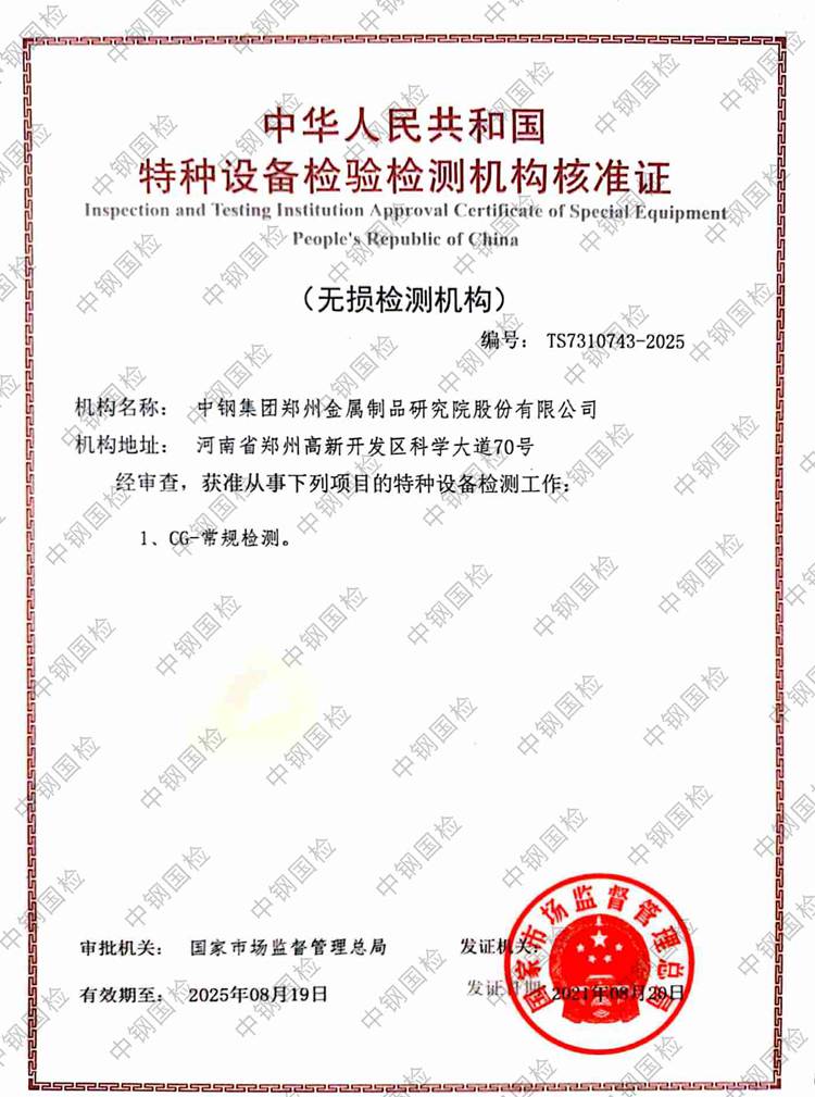 中鋼國檢成功通過特種設備檢驗檢測機構擴項評審,于近日獲得由國家市場監督管理總局頒發的中華人民共和國特種設備檢驗檢測機構核準證書,標志著中鋼國檢檢測能力再上新臺階。...